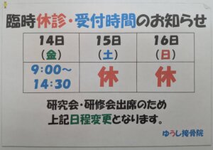 期間中、御来院を予定してくださっていた方々にはご迷惑おかけ致します。お間違いのないようご確認よろしくお願い致します。